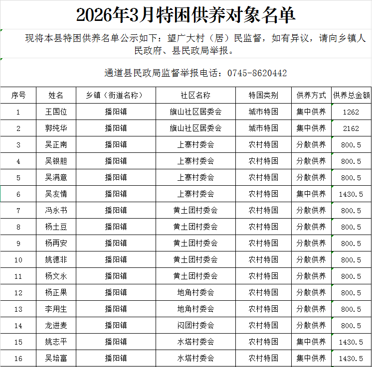 2026年3月特困供养对象名单