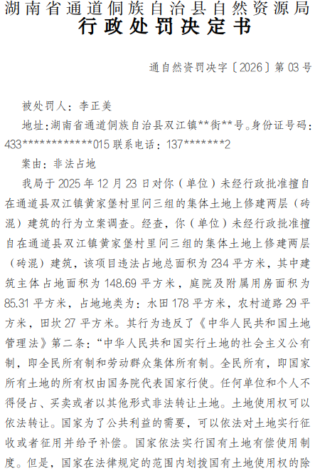 通道侗族自治县自然资源局行政处罚决定书(通自然资罚决字〔2026〕第03号)