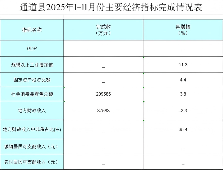 通道县2025年1-11月份主要经济指标完成情况表