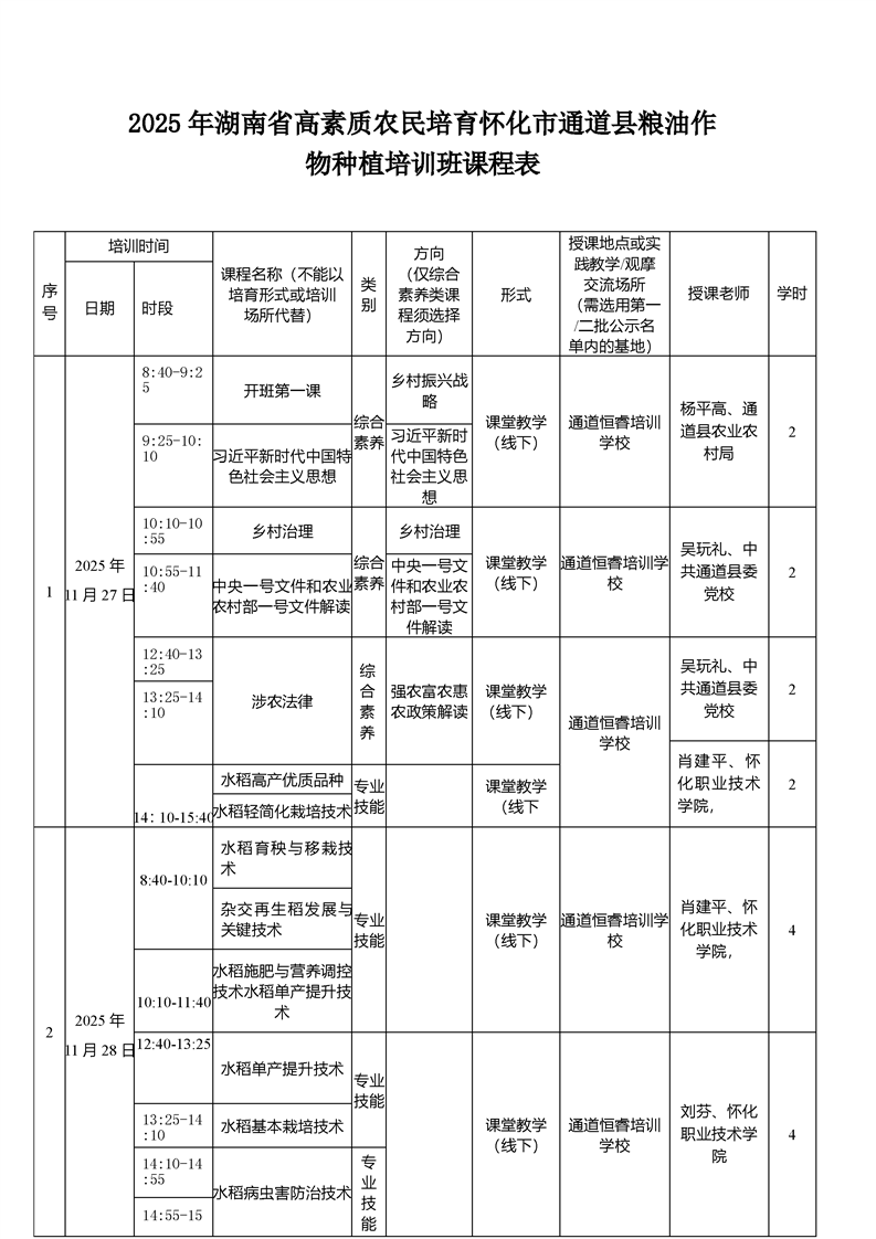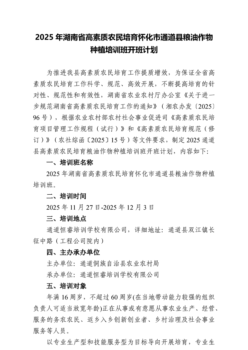 2025年湖南省高素质农民培育怀化市通道县粮油作物种植培训班开班计划