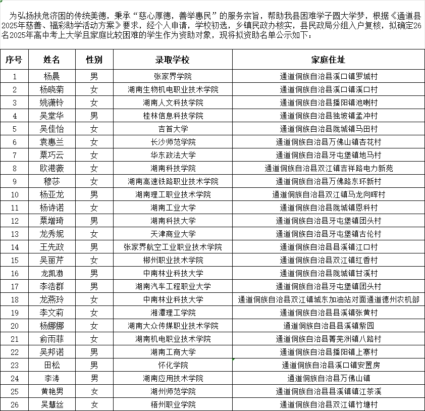 2025年县民政局慈善、福彩高中升大学拟助学名单公示