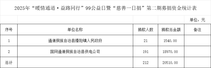 附件:2025年“暖情通道·益路同行”暨99公益日“慈善一日捐”第二期募捐资金统计表
