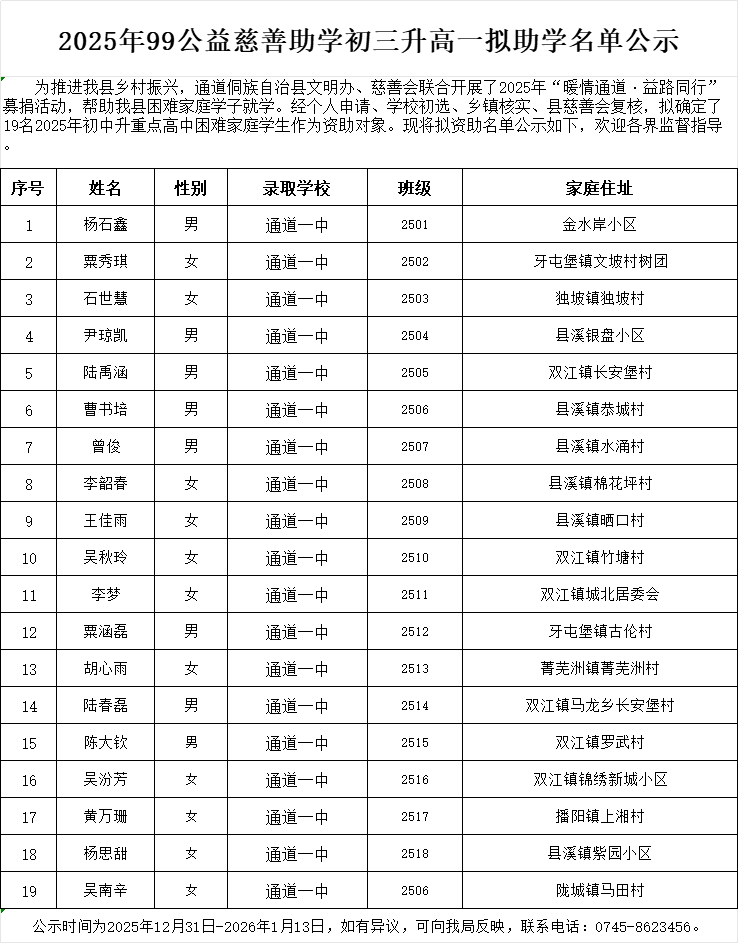 2025年99公益慈善助学初三升高一拟助学名单公示