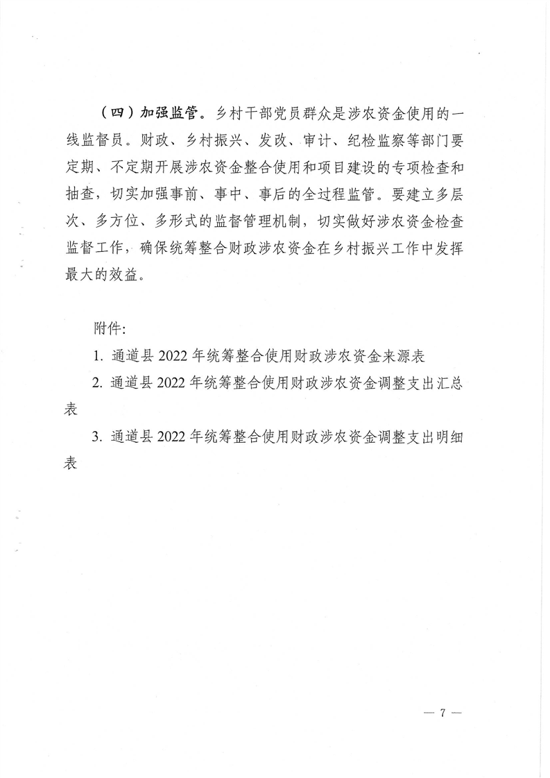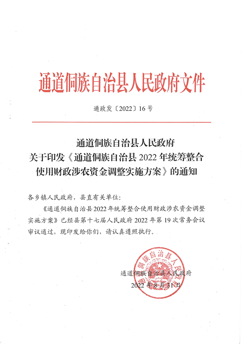 通道侗族自治县人民政府关于印发《通道侗族自治县2022年统筹整合使用财政涉农资金调整实施方案》的通知
