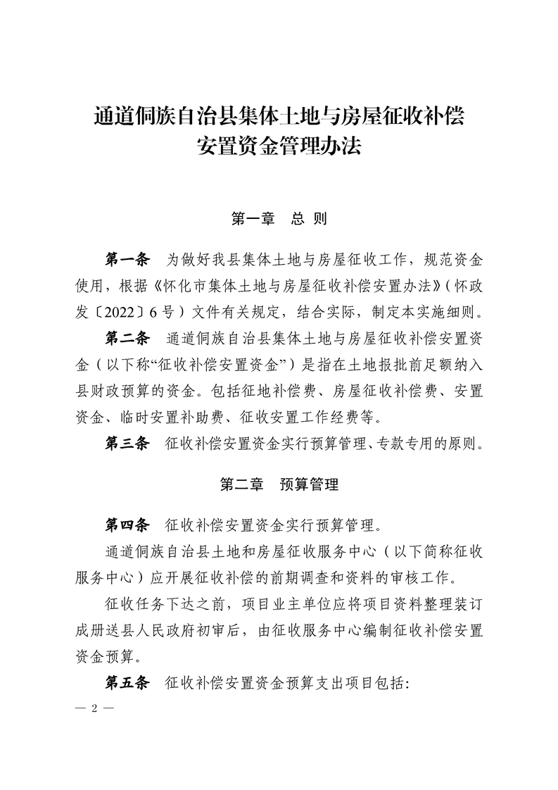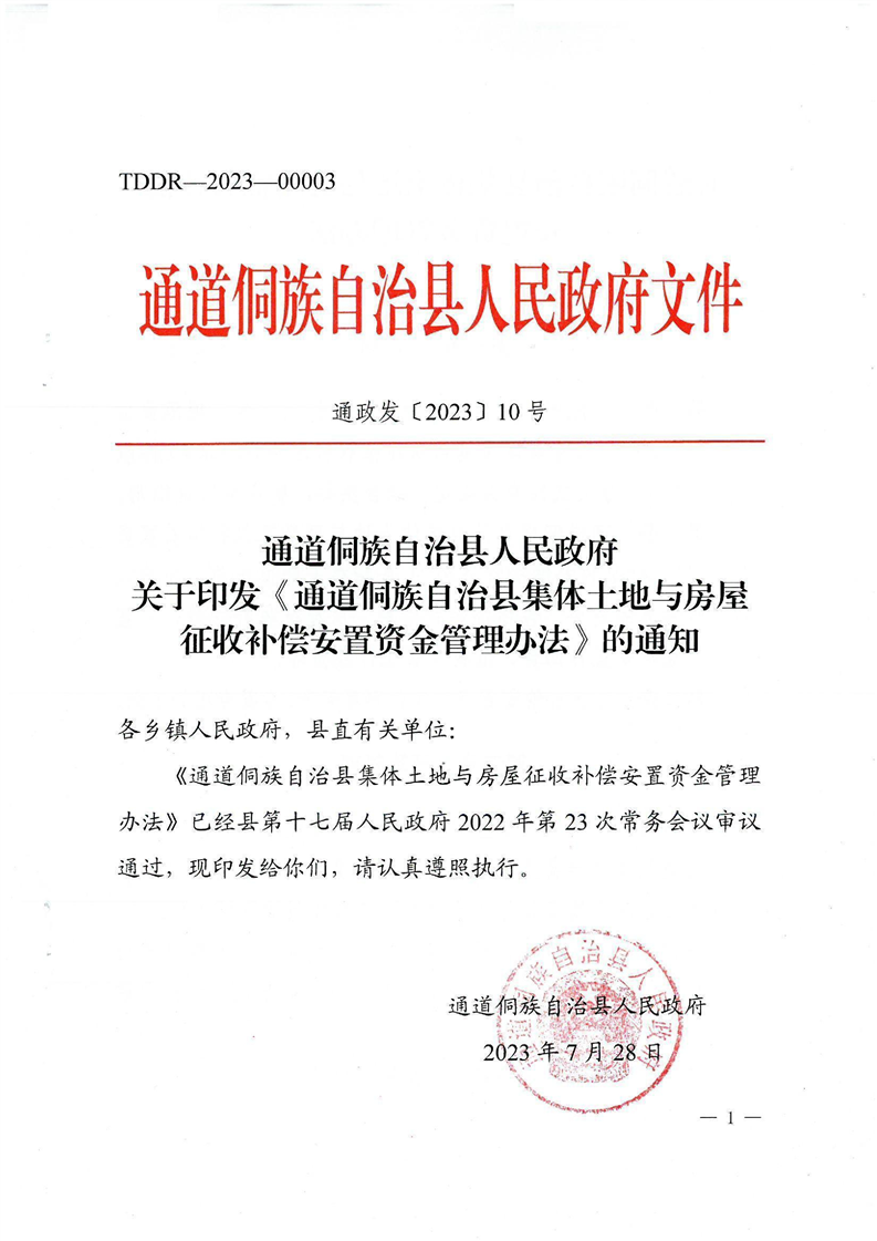 通道侗族自治县人民政府关于印发《通道侗族自治县集体土地与房屋征收补偿安置资金管理办法》的通知