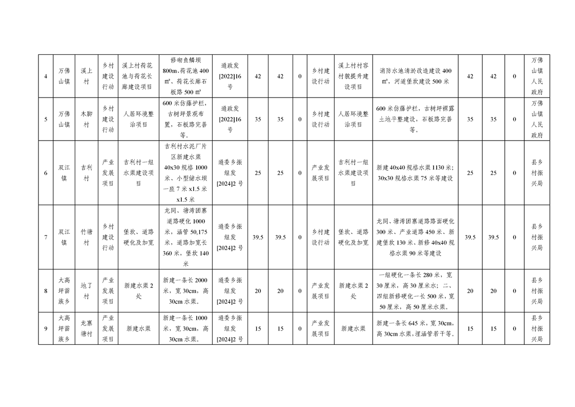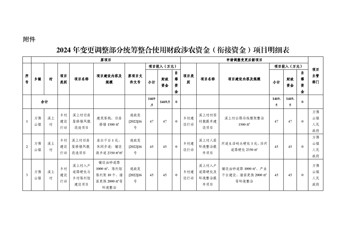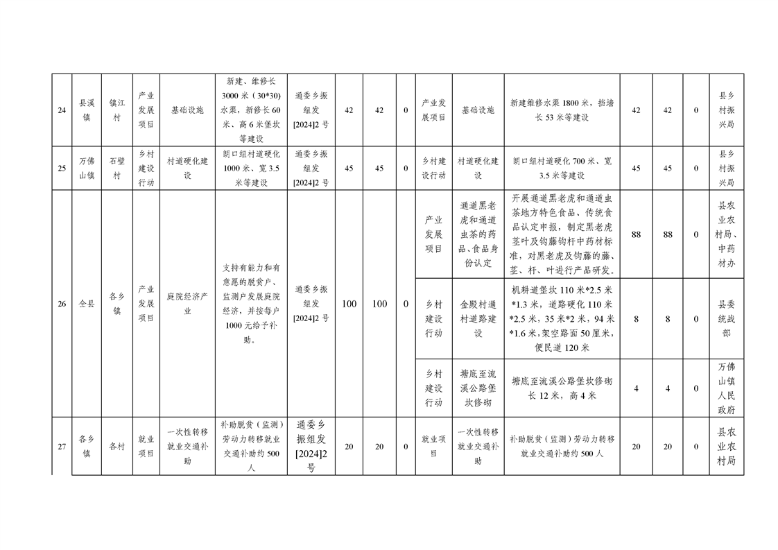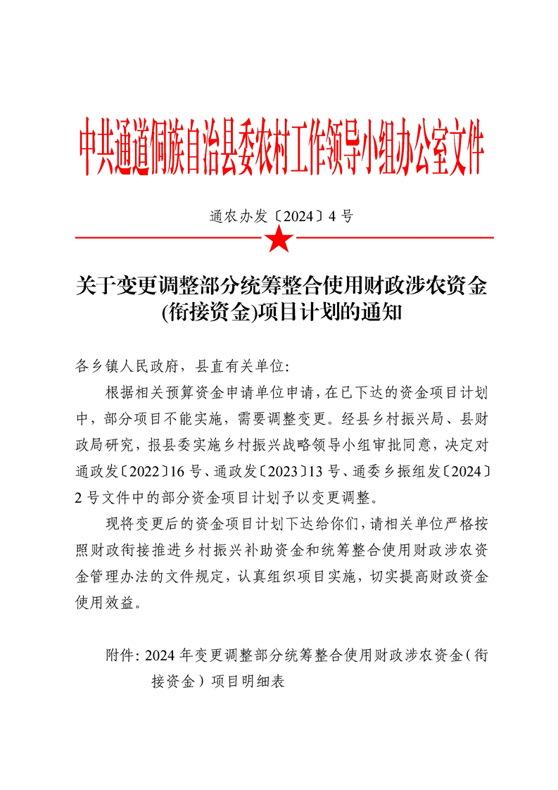 (通农办发〔2024〕4号)关于变更调整部分统筹整合使用财政涉农资金(衔接资金)项目计划的通知