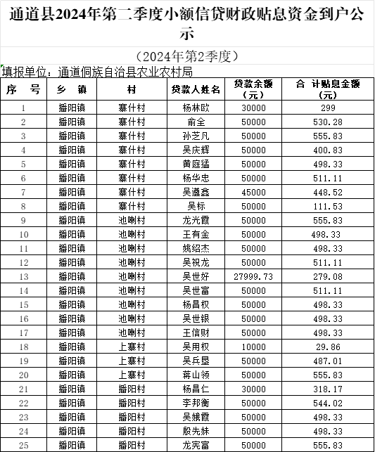 通道县2024年第二季度小额信贷财政贴息资金到户公示