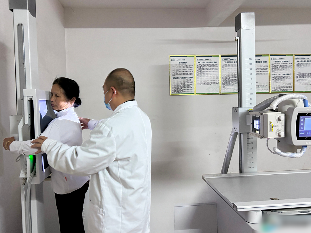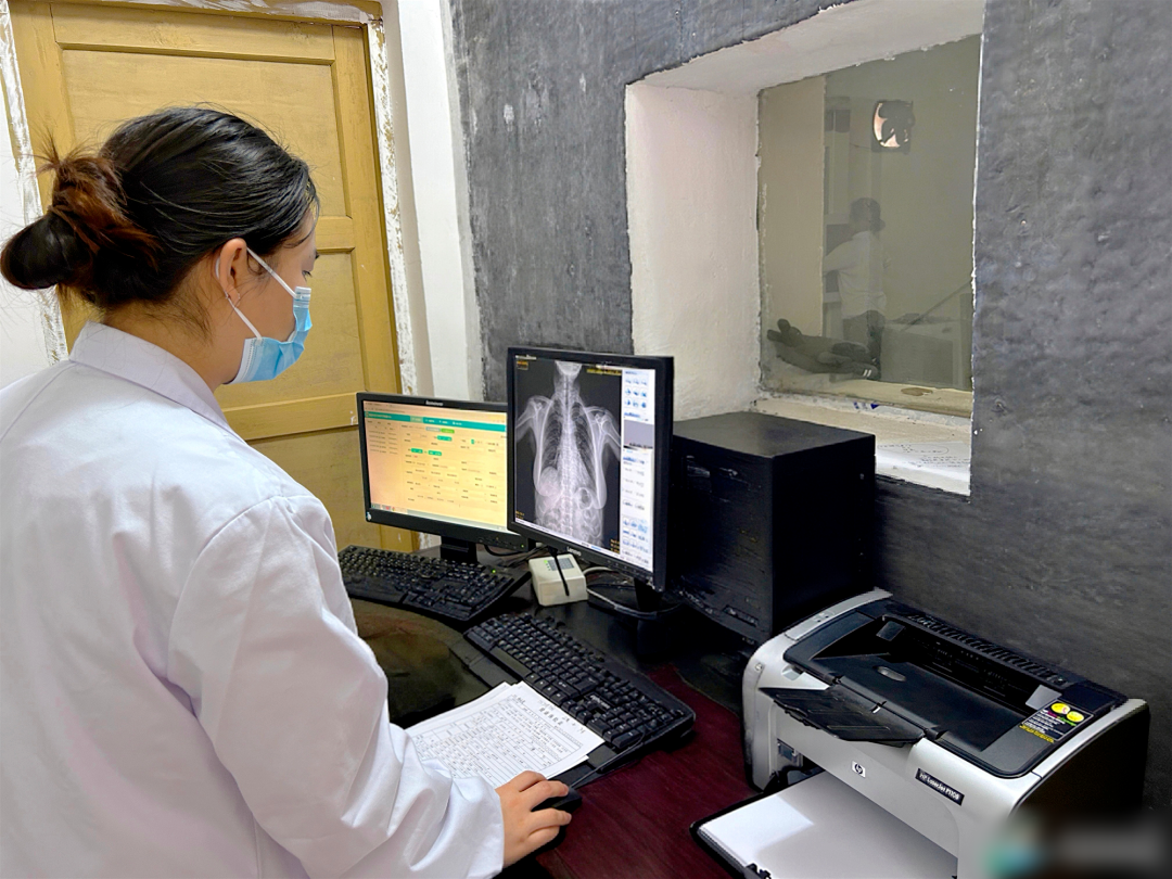 体检现场,镇卫生院医护人员有序为居民开展胸部DR拍摄等检查,影像数据通过医共体信息化平台实时、无损、高速传输至县第一人民医院放射科影像中心。县级放射诊断专家团队第一时间逐一审阅、精准分析,快速出具规范权威的诊断报告,再通过网络即时回传基层,全程高效便捷。