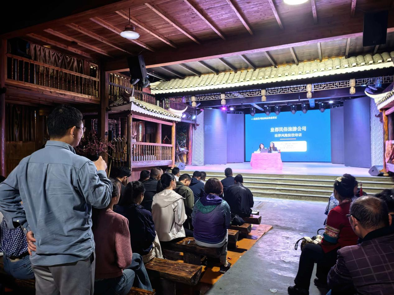 2026年4月28日,县司法局联合湖南万佛山侗寨风景名胜区管理处(以下简称“万管处”),在皇都侗文化村景区组织开展法律风险防控培训,特邀律师现场授课,万管处全体工作人员、皇都民俗旅游公司全体工作人员和景区演员、部分群众参加培训。