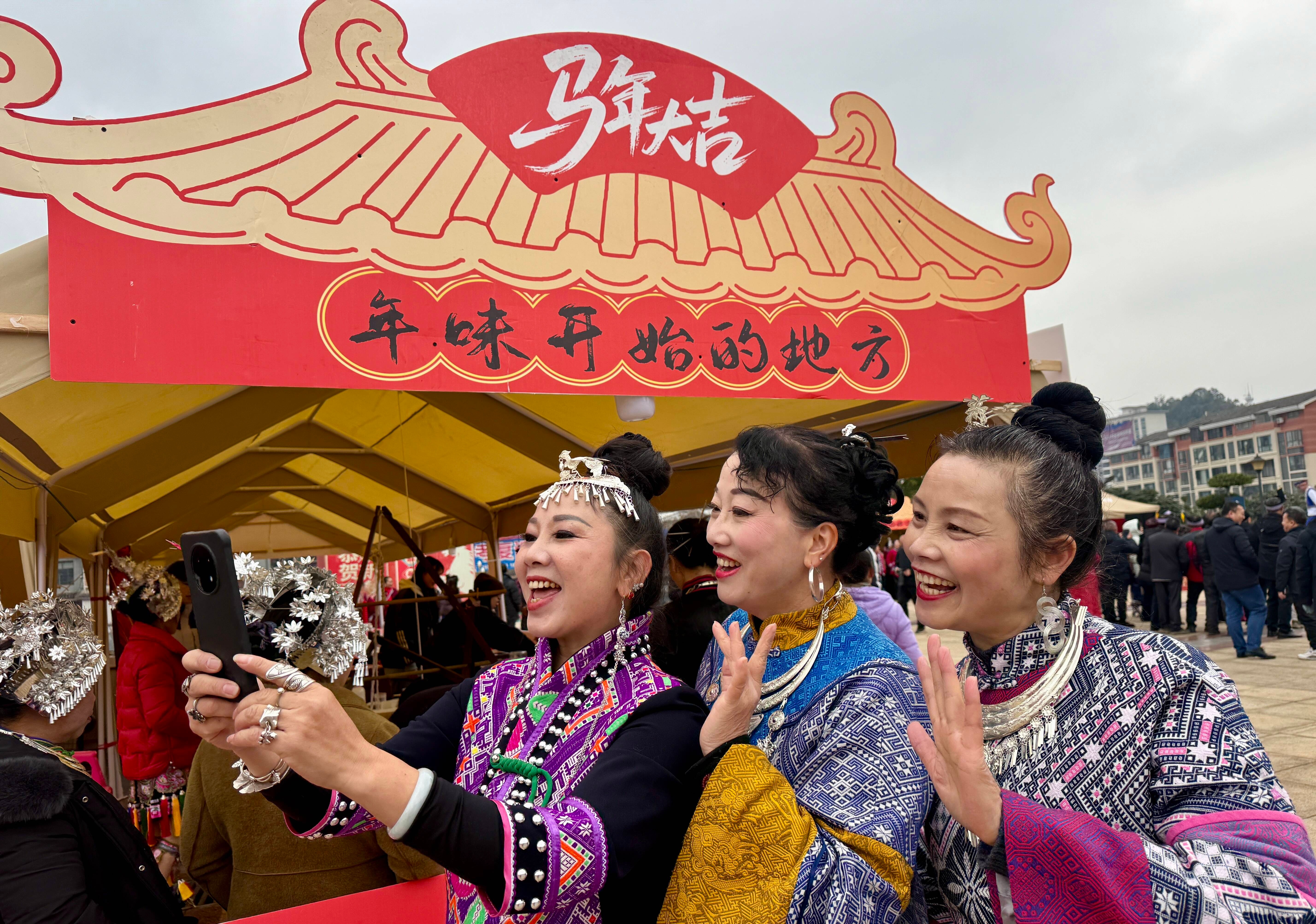 2月9日,通道侗族自治县萨岁文化广场,侗家姐姐们通过手机视频与远在深圳的朋友分享家乡的年味。当天,该县“侗寨过大年•非遗贺新春”大型迎春活动在此举行,侗品展销、民俗表演、非遗体验、送春联等,满满的侗家年味让人陶醉。(陈俊宇 摄)