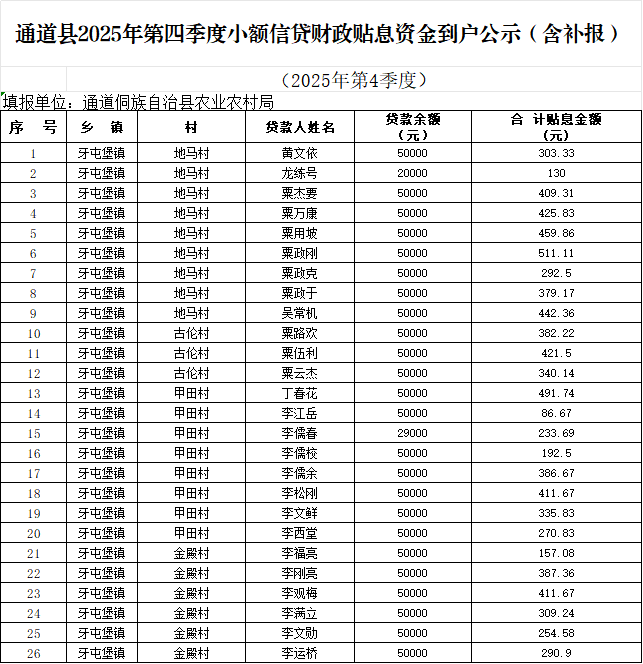 通道县2025年第四季度小额信贷财政贴息资金到户公示(含补报)