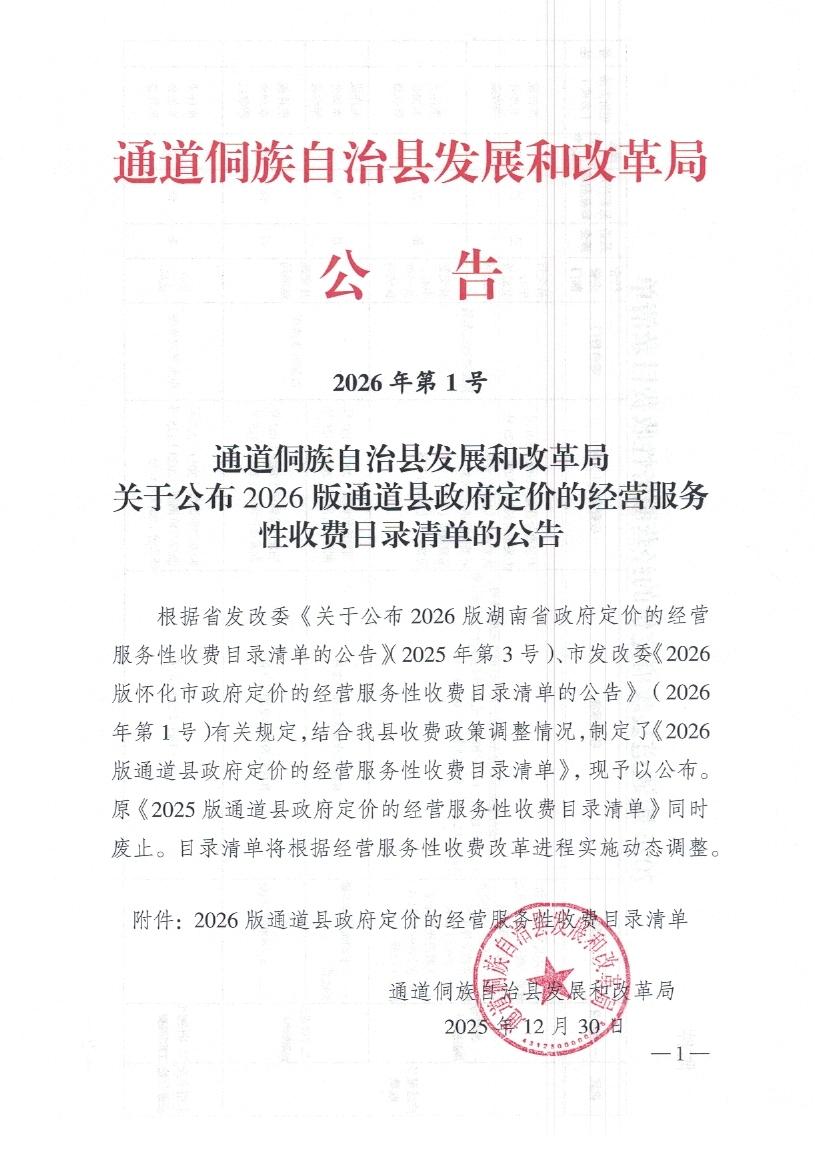 通道侗族自治县发展和改革局关于公布2026版通道县政府定价的经营服务性收费目录清单的公告