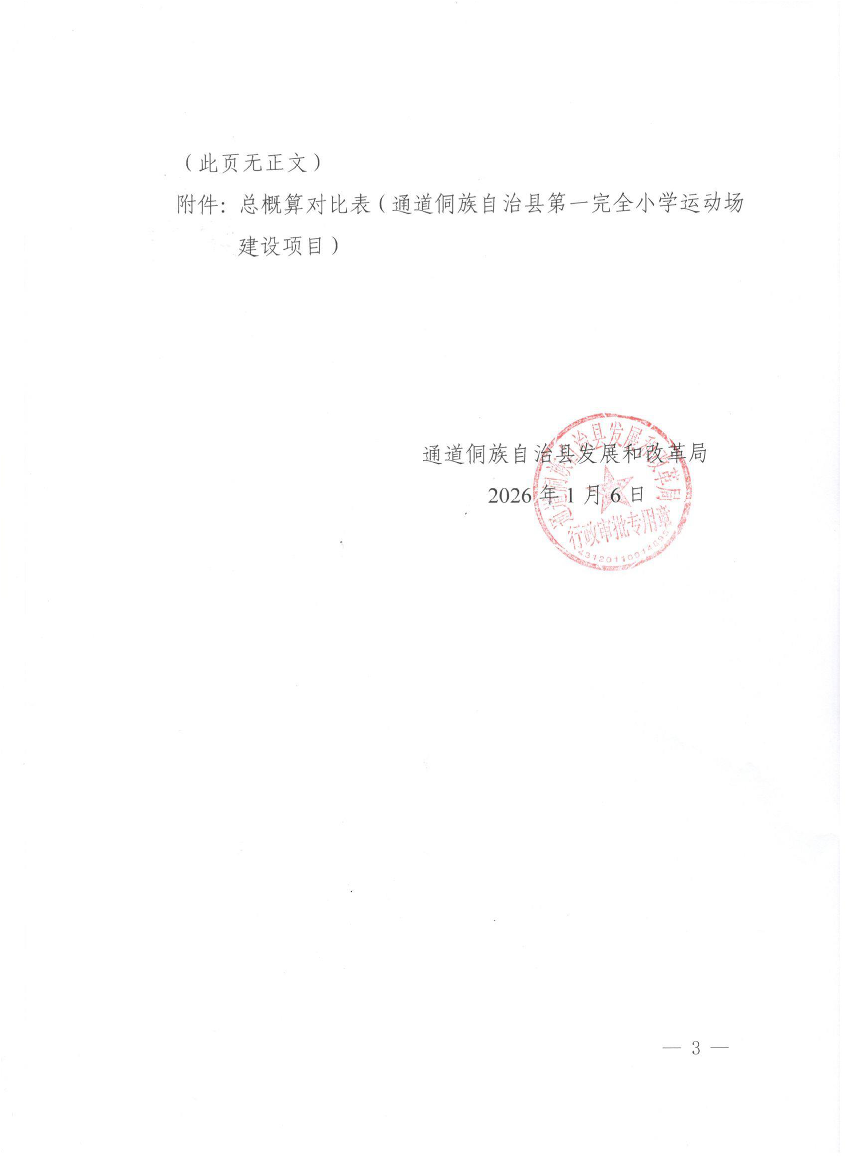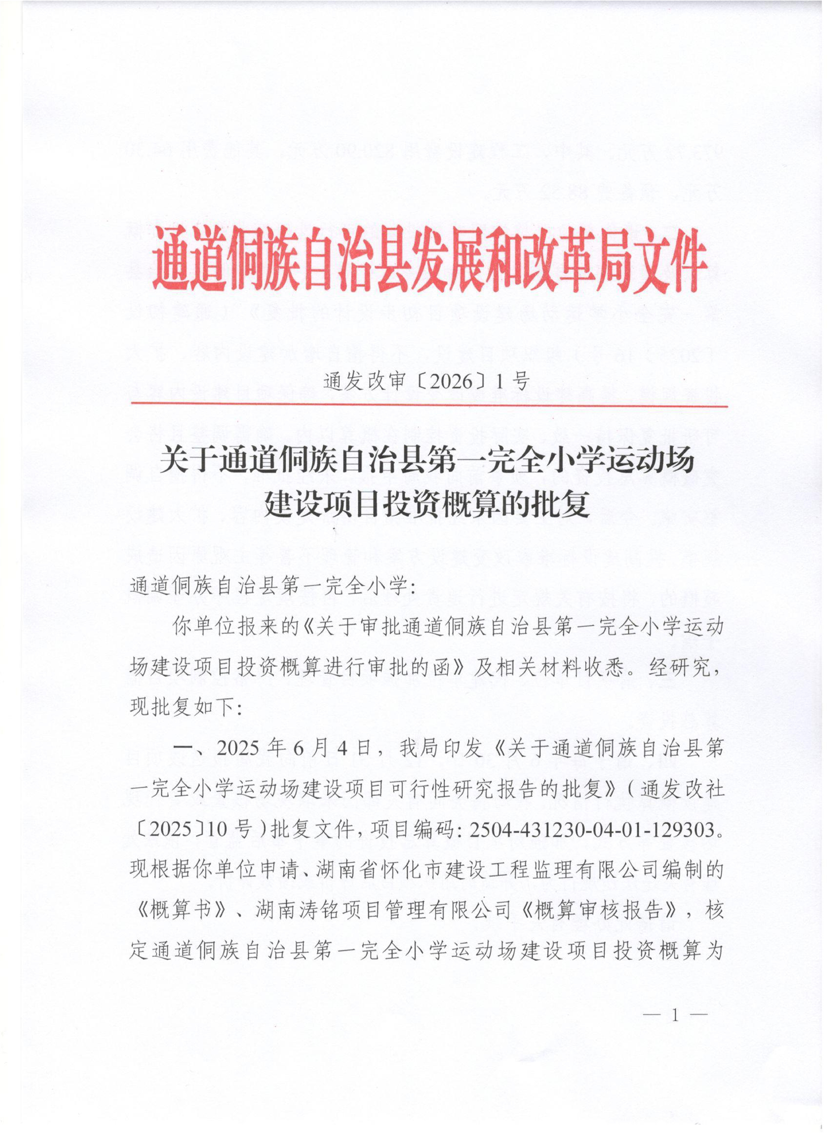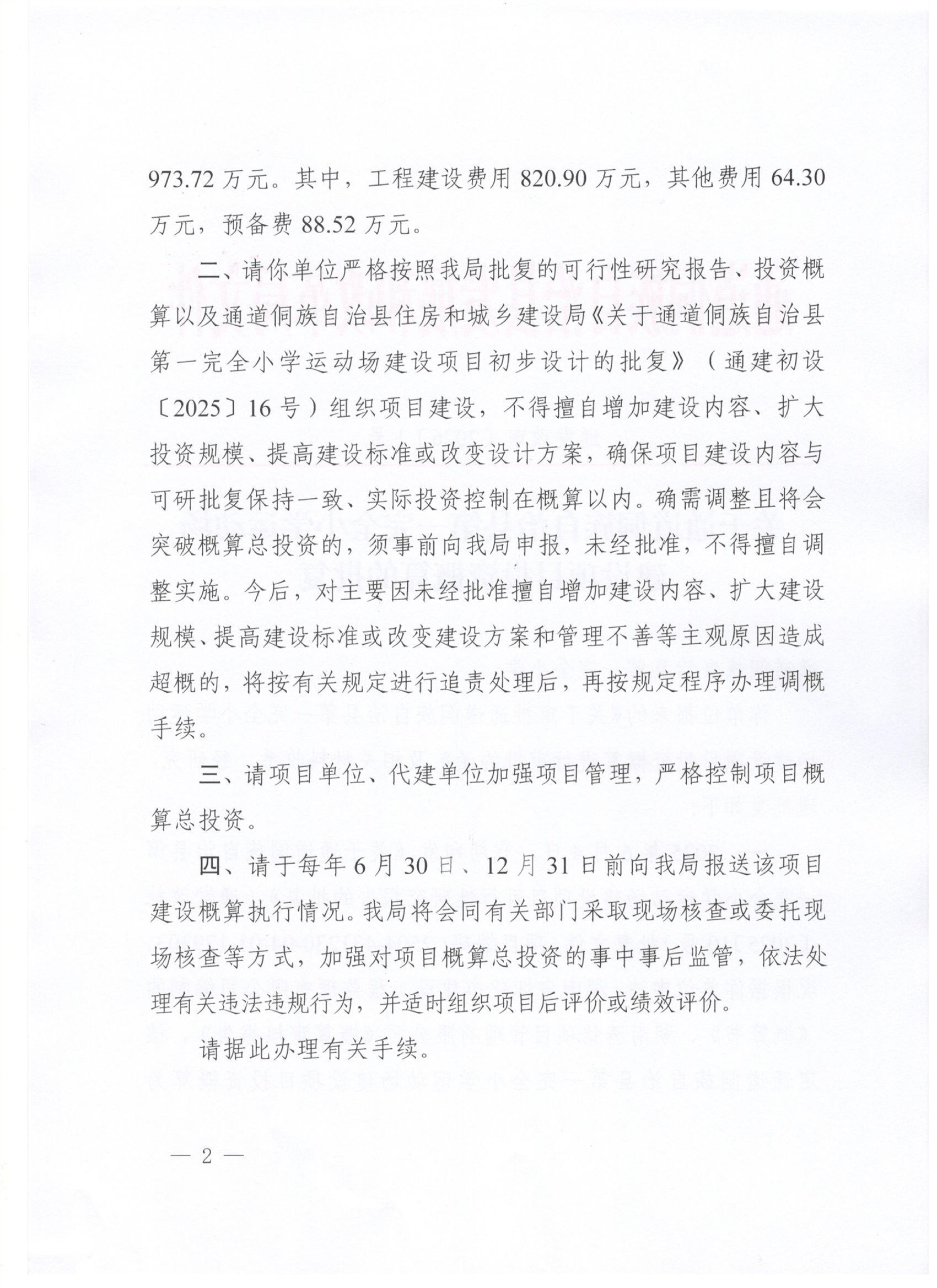 关于通道侗族自治县第一完全小学运动场建设项目投资概算的批复