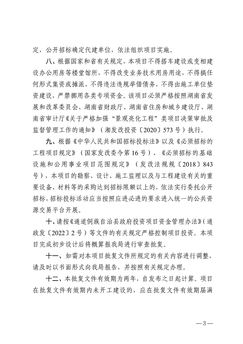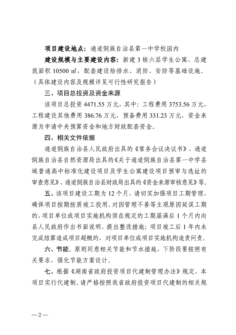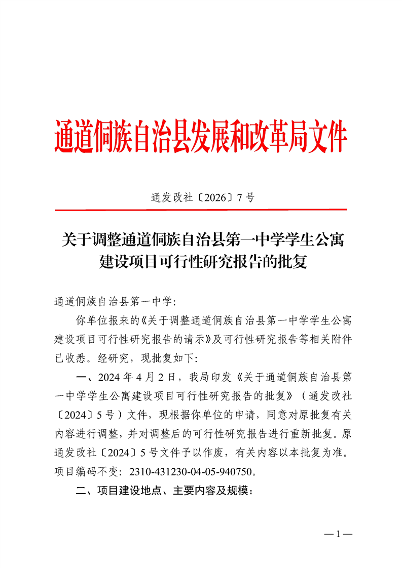 关于调整通道侗族自治县第一中学学生公寓建设项目可行性研究报告的批复