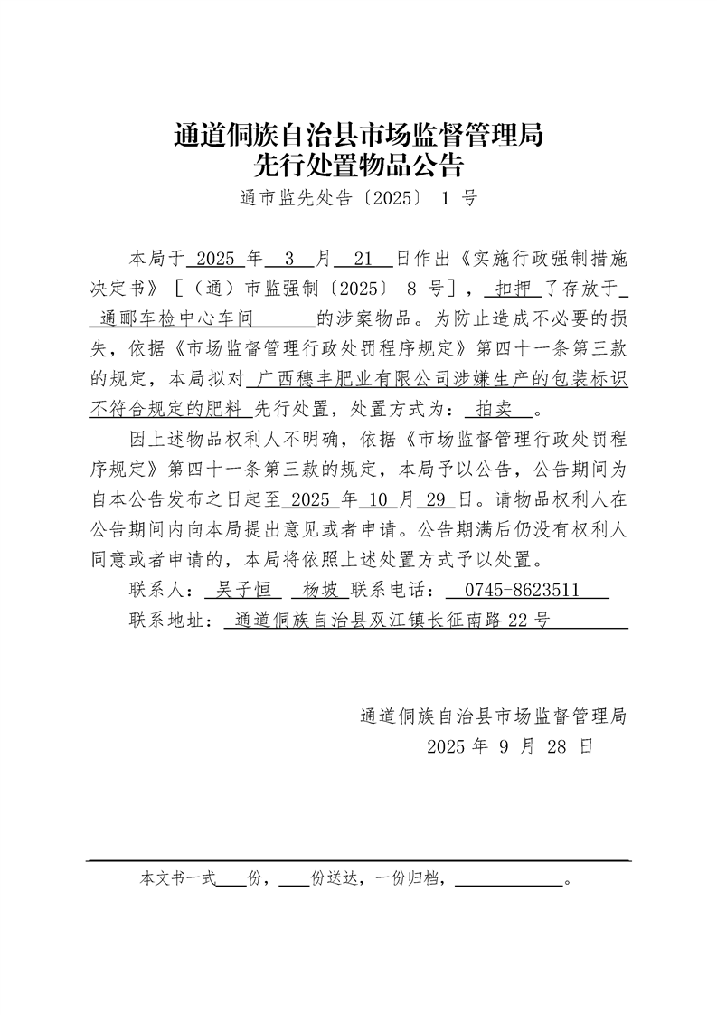 通道侗族自治县市场监督管理局先行处置物品公告 通市监先处告〔2025〕1号