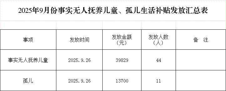 2025年9月份事实无人抚养儿童、孤儿生活补贴发放汇总表