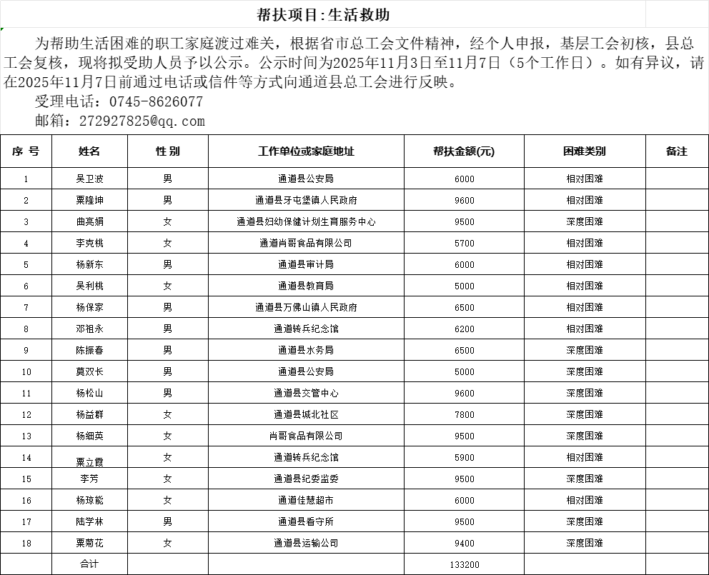 通道县总工会2025年建档困难职工救助公示名单(2025年度央财资金)
