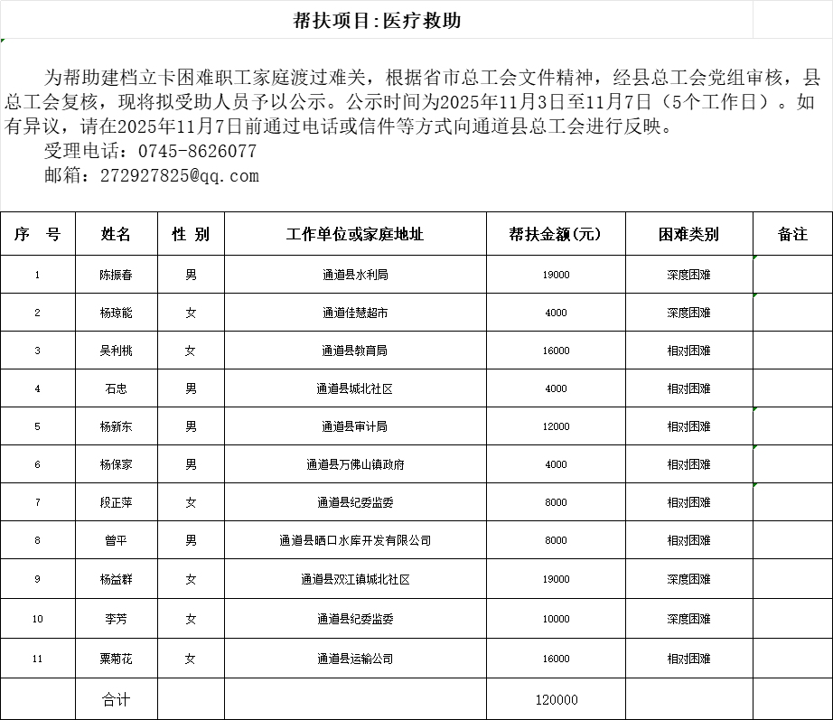 通道县总工会2025年建档困难职工医疗救助公示名单(2025年度央财资金)