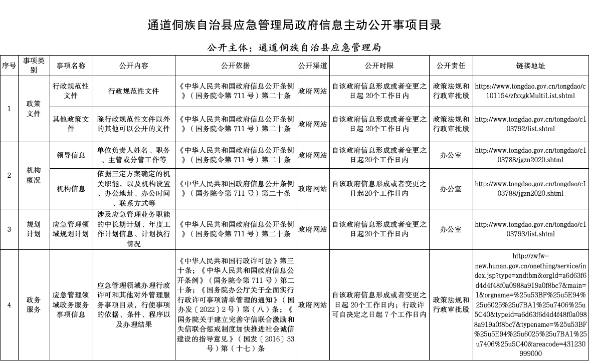 通道侗族自治县应急管理局政府信息主动公开事项目录